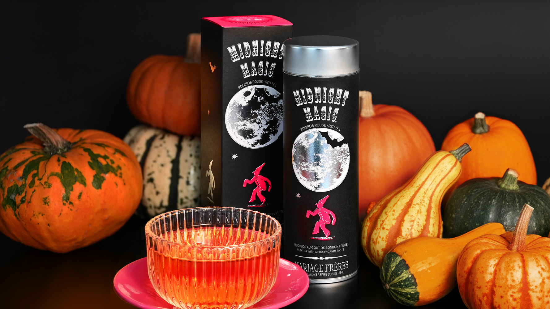 Midnight Magic black tea delights the palate with playfully candied notes, full of childhood memories. The beautiful black tea leaves are sprinkled with vivid orange flowers exhaling a seductive aroma, both fruity and sweet. The amber colour liqueur can be savoured like a sugary bonbon, gourmand and irresistibly tart. Here we rediscover childhood memories and the delightful thrill of All Hallow’s Eve: « trick or treat ?! » A « candy » tea, deliciously spellbinding!