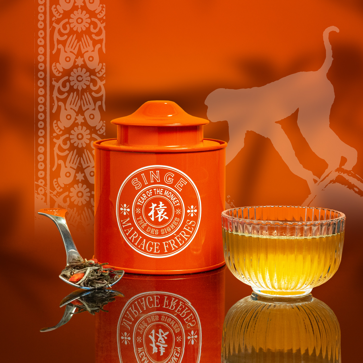 A dargli vita sarà il Thé des Signes® dell'Anno della Scimmia, un tè bianco gioioso, arricchito da note frizzanti di mandarino, clementina e arancia. Le esplosioni fruttate delle bacche di goji, emblematiche della Collezione Thés des Signes®, apportano il loro potere antiossidante a questo delizioso elisir di giovinezza.